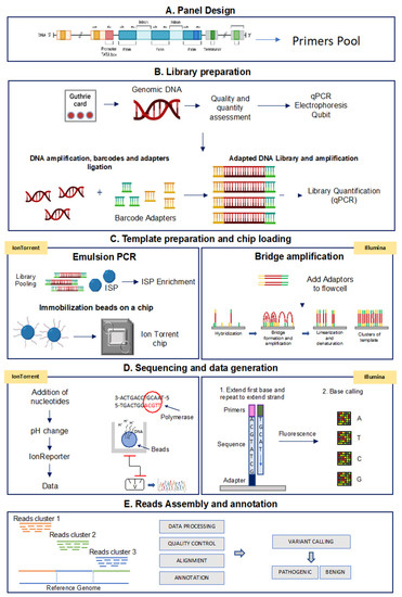 Analytical workflow of targeted sequencing for the Ion Torrent and Illumina methods. (A) Panel design: the Designer software helps to create custom assays based on PCR target selection. (B) Library preparation: library construction is the preparation of the nucleic acid target into a form compatible with the sequencing system to be used. (C) Template preparation and chip loading: target enrichment is used in NGS workflows to capture only genomic DNA regions of interest. (D) Sequencing and data generation: IonTorrent platform: microwells of the chip is flooded by nucleotides that when binding to the complementary nucleotide on a template, release an ion. At each flow, the electrical signal at each well is measured, indicating that a reaction has occurred; Illumina platform: the fragments are clonally amplified on the slide utilizing fluorescently labeled reversible-terminator nucleotides; (E) Read assembly and annotation: starting from Binary Alignment Map (BAM) and Variant Call Format (VCF) files, variants are prioritized based on localization, functional effect, mode of inheritance, coverage and Minor Allelic Frequency (MAF) to obtain disease-correlated variants.