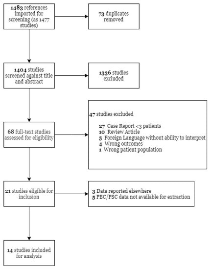 Flow diagram of the studies included in the systematic review and meta-analyses. PBC—Primary biliary cholangitis; PSC—Primary sclerosing cholangitis.