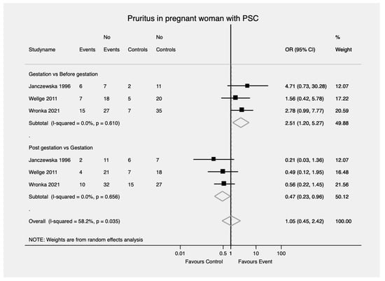 Women with PSC were more likely to develop new or worsening pruritus during gestation compared to before the onset of pregnancy as well as compared to the postpartum period (OR = 2.51; 95% CI, 1.20—5.27 and OR = 0.47; 95% CI, 0.23—0.96) (Figure 5). No heterogeneity was found in either comparison (I2 = 0%, p = 0.61 I2 = 54.9%, p = 0.05, respectively).