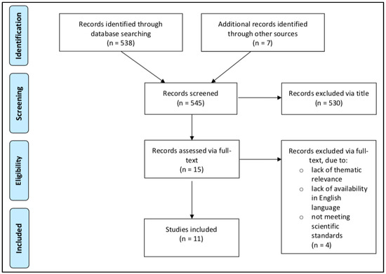 After careful evaluation, a total of eleven clinical studies were extracted from 545 articles that met the predefined objectives. The structure of the article selection process is described as a flow diagram in Figure 1. Studies published between 2009 and 2020, enrolling a total of 472 participants, were included. Two studies were conducted in a group of individuals with T1DM [9,25], two studies in individuals with MetS [26,27], and seven studies in individuals who were overweight or obese [11,28,29,30,31,32,33]. No studies were found in which combat sports were investigated in individuals with T2DM.