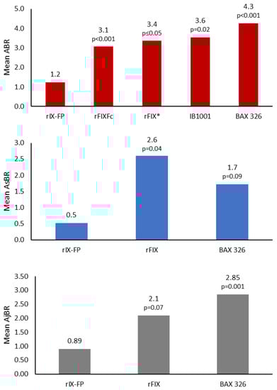 Furthermore, while direct comparisons between products cannot be made, it has been observed that the prophylactic efficacy of rIX-FP is favorable over other standard half-life rFIX and extended half-life products []. A systematic literature review indirectly compared the efficacy of rFIX products in adult patients and showed that ABR with 7-day rIX-FP prophylaxis was significantly lower than with standard half-life (p ≤ 0.05) and other extended half-life (p < 0.001) rFIX products (Figure 3) [].