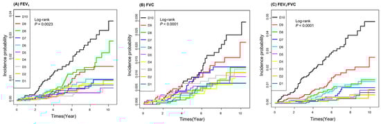 Cumulative incidence function curves of lung cancer according to lung function decile. (A) FEV1, (B) FVC, (C) FEV1/FVC.