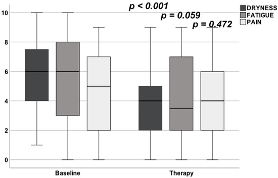 The combined ESSPRI score at baseline was 5.0 ± 2.1. After the treatment period this score improved statistically significantly to a mean score of 4.1 ± 2.4 (p = 0.012). Looking into the score, this improvement was based on an improvement of the dryness score, which improved from a baseline level of 5.7 ± 2.1 to a level of 4.1 ± 2.4 (p < 0.001, Figure 1, Table 3).