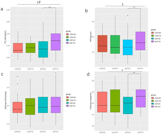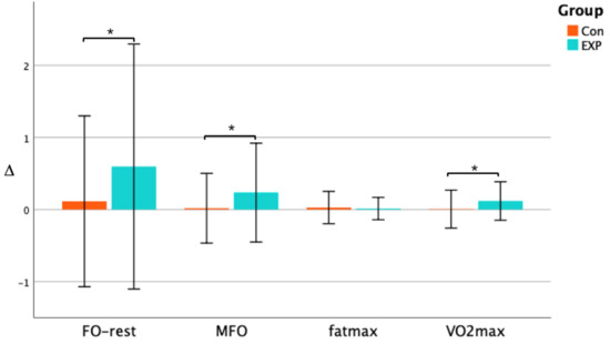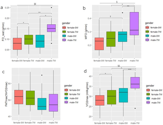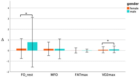 3.4. Changes in the Fat Oxidation and VO2max between genders in the EXP Group