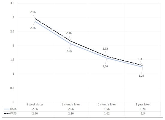 Two weeks later, in the video-assisted lobectomies group, the NRS value was 2.96 (with a standard deviation of 0.83), while in the robotic group it was 2.86 (a standard deviation of 1.05); 3 months later in Group I the value was 2.16 (standard deviation of 0.65) and in Group II was 2.06 (standard deviation: 0.87); 6 months later in Group I the NRS value was 1.62 (standard deviation of 0.64), while in Group II was 1.56 (standard deviation of 0.67); 1 year later in Group I the value was 1.30 (standard deviation of 0.54) and in Group II was 1.24 (standard deviation of 0.47). For each time interval, no statistically significant differences were found (p > 0.05) (Figure 3).
