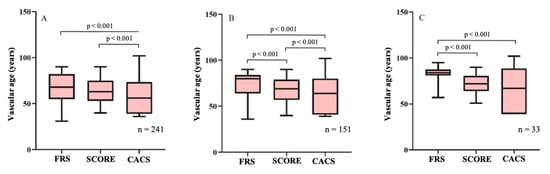 Figure 1 demonstrates the comparison of the different score-based vascular ages. Regarding the entire cohort, no statistical difference was observed between FRS- and SCORE-derived vascular ages (p = 0.08), while the CACS-adjusted biological age was significantly lower than the other 2 age derivates (both p < 0.001, Figure 1A). Figure 1B demonstrates the pairwise comparisons of the FRS, SCORE, and CACS vascular ages in hypertensive patients (n = 151). All of the comparison combinations were significant, as FRS-adjusted biological age was significantly higher than SCORE and CACS vascular ages and CACS-adjusted age was significantly lower than FRS and SCORE biological ages (all p < 0.001). Regarding patients with documented diabetes (n = 33), vascular age calculated by FRS remained statistically higher than SCORE- and CACS-derived vascular ages (both p < 0.001), while median biological age measured by SCORE and CACS did not differ significantly (p = 0.16, Figure 1C).