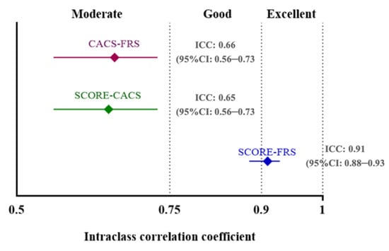 Intraclass correlation coefficients for the comparison of different risk score-based models. Intraclass correlation coefficient was calculated to assess correlation between different score-based vascular ages. While SCORE and FRS displayed excellent correlation, CACS only moderately correlated with FRS and SCORE. All pairwise combinations proved to be statistically significant (all p < 0.001). CACS, coronary artery calcium score; FRS, Framingham Risk Score; SCORE, Systematic Coronary Risk Evaluation.
