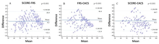 Bland-Altman plots demonstrating the differences between the risk equations. Compared with FRS, SCORE overestimated vascular age by a mean of 4.2 years (A), while on average, the CACS-based model measured 12.2 and 8.1 years less than the FRS (B) and SCORE (C) equations. All pairwise combinations proved to be statistically significant (all p < 0.001). SCORE, Systematic Coronary Risk Evaluation; FRS, Framingham Risk Score; CACS, coronary artery calcium score.