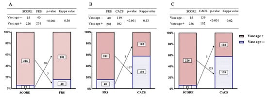 Depending on the relation of their arterial age and the corresponding chronological age, patients were classified either as vasc age + (vascular age > chronological age) or vasc age − (vascular age ≤ chronological age) for all three methods (Figure 4). Overall, 92/241 (38.2%) of the patient cohort was found to be vasc age + with all 3 methods. On the other hand, only 7/241 (2.9%) patients were found to have a healthy vasculature and were therefore classified as vasc age–with all 3 methods. The overall agreement between the different methods proved to be fair in the case of SCORE-FRS comparison (κ = 0.30), while only slight agreements appeared for FRS-CACS and SCORE-CACS comparisons (κ = 0.13 and κ = 0.02, respectively). When compared with the FRS-adjusted vascular age groups, the utilization of CACS resulted in the reclassification of 115/241 (47.7%) patients in total. Overall, 107/201 (53.2%) subjects previously classified as vasc age + by FRS were assigned to the vasc age–group with CACS-based calculations (p < 0.001). When results of the SCORE- and CACS-derived classification of individual patients were compared, adjusted vascular age classification was discordant in 134/241 (55.6%) cases, including 129/226 (57.1%) subjects who were classified as vasc age + by SCORE but were reclassified as vasc age–by CACS-based calculations (p < 0.001).