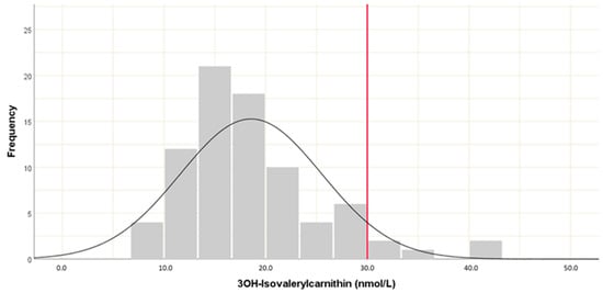 More than 20 different markers of biotin status have been described. These are typically classified as either direct or indirect markers. 3HIVc is an indirect marker that rises in response to diminished activity of the methylcrotonyl-coenzyme, a biotin-dependent enzyme []. Analysis of serum 3HIVc levels by LC-MS/MS has been found to be one of the most sensitive markers of biotin depletion []. However, to our knowledge, no clear clinical cut-off value has previously been defined for functional biotin deficiency. Therefore, we calculated the predicted reference range for serum 3HIVc levels by calculating percentile values within the control group and took the 95th percentile as a cut-off for functional biotin deficiency.