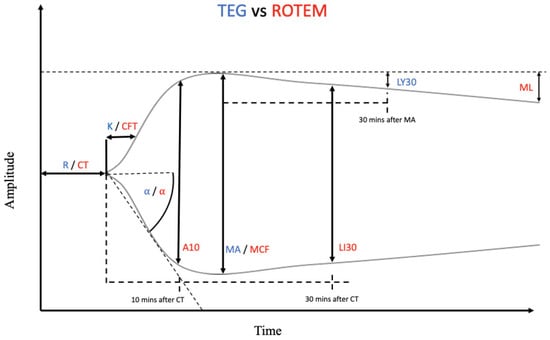 Depiction of a normal thromboelastography (TEG)/rotational thromboelastometry (ROTEM) tracing. The blue abbreviations represent the parameter labels for TEG, whereas the red abbreviations represent the parameter labels for ROTEM. Many of these parameters are representations of the same measurements between the two instruments, only with different nomenclature. Reaction time (R) and clot time (CT) are both the measurement of how long it takes for the transducer to be displaced 2 mm on the y-axis. Clot kinetics (K) and clot formation time (CFT) specify the amount of time it takes for the clot amplitude to grow to 20 mm after initial 2 mm clot growth. K and CFT represent initial clot strength and clot formation kinetics respectively. Alpha (α)-angle, in both TEG and ROTEM, represents the angle formed between the horizontal axis and the line formed from 0–20 mm amplitude. α-angle is calculated and utilized to measure the rate at which clot formation occurs. A10 is the amplitude reached 10 min after CT. Maximum amplitude (MA) and maximum clot firmness (MCF) refer to the clot’s maximum strength and are a measurement of the platelet–fibrin interaction. Lysis index at 30 min (LI30), a parameter unique to ROTEM, represents the percentage of MCF remaining 30 min after CT. Lysis at 30 min (LY30), a TEG parameter, refers to the percentage decrease in maximal clot amplitude 30 min after MA is achieved. Maximum lysis (ML) refers to the percentage decrease in clot amplitude measured at the end of the run [,,].