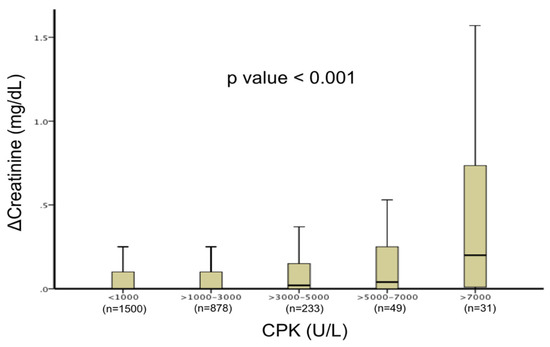 Relationship between CPK level elevations and creatinine changes. Box plot chart demonstrating creatinine changes stratified by peak creatine phosphokinase levels during hospitalization. A gradual increase in creatinine change was observed with rising CPK levels (p for trend <0.001).