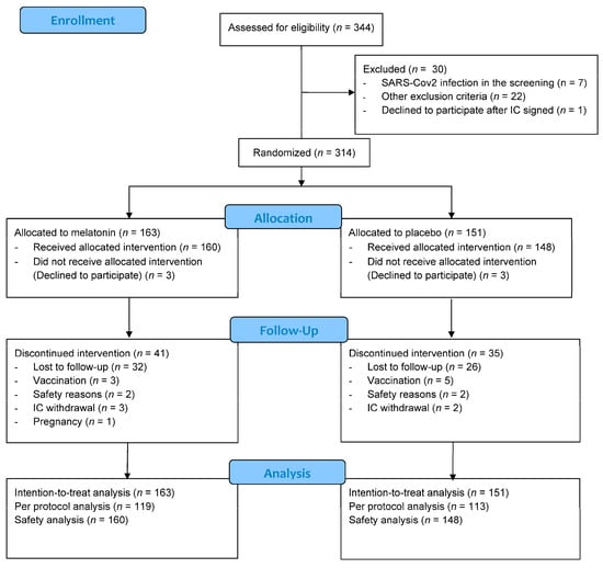 A total of 344 participants underwent the screening visit for the study and signed the informed consent; however, 30 of them were excluded due to different reasons. The remaining 314 participants were randomised, 163 to melatonin and 151 to placebo constituting the ITT population (Figure 1). The median age in the ITT population was 40 years [IQR 32, 49], and women represented 81.2% (n = 255) of the participants in this population. A total of 120 participants had at least one comorbidity: 42.4% (n = 64) of the participants receiving placebo and 34.4% (n = 56) of the participants receiving melatonin. Forty participants had at least one risk factor for severe COVID-19 (12.7%): 24 in the placebo arm and 16 in the melatonin arm (Table 1). Other demographic factors were compared between groups (Table 1).