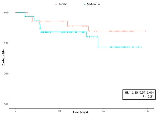 A total of 294 adverse events (AEs) were detected throughout the study in 127 participants (139 in the placebo arm and 155 in the melatonin arm), most of them were graded as mild (78.34%), and none were graded as severe. A total of 110 AEs were related to the study treatment: 43 in the placebo arm (30.9% of the AEs reported for placebo) and 67 in melatonin (43.2% of the AEs reported for melatonin); the incidence of AEs related to treatment differed significantly between the two groups (p = 0.04).