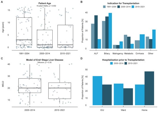 Univariate analysis of patient data. (A) Patient age over the three historic cohorts. (B) Indication of pediatric liver transplantation. (C) Laboratory Model of End-Stage Liver Disease (MELD) (D) Hospitalization prior to transplantation.