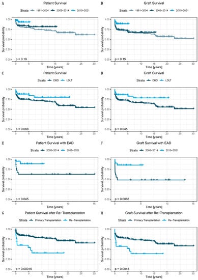 Patient and graft survival after pediatric liver transplantation. p-value: log-rank comparison of survival curves. (A) Patient survival compared over three cohorts. (B) Graft survival compared over three cohorts. (C) Patient survival in Living Donor Liver Transplantation and Donation after Brain Death Transplantation. (D) Graft survival in Living Donor Liver Transplantation and Donation after Brain Death Transplantation. (E) Patient survival in patients with early allograft dysfunction in the last two cohorts. (F) Graft survival in patients with early allograft dysfunction in the last two cohorts. (G) Patient survival after re-transplantation. (H) Graft survival after retransplantation. Abbreviations: Early Allograft Dysfunction (EAD), Donation after Brain Death (DBD), Living Donor Liver Transplantation (LDLT).