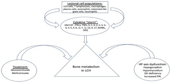 There are several factors that may affect the clinical course of LCH such as treatment with glucocorticoids, anterior pituitary hormone deficiencies, and the inflammatory cytokines which provoke lesional and systemic alterations of various components known to negatively affect bone metabolism (Figure 1).
