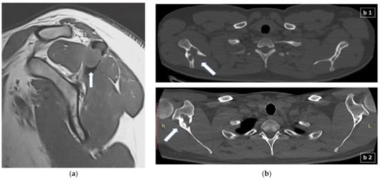 (a) Sagittal T1-weighted MR scan showing a 1.5 cm lytic lesion with soft mass tissue extension (arrow) which disrupts the cortex of the left acromion and extents mainly to the supraspinatus muscle; (b) appearance of lytic bone lesion in CT: (b1) transverse CT scan section showing an extensive lytic lesion of the right scapula (arrow); (b2) different transverse CT scan section of the previous lytic lesion of the right scapula, one year later and following treatment with denosumab, depicting now scleroting margins (arrow) suggestive of the healing process. R: right; L: left.