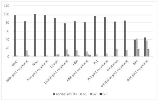 The percentage of patients before and after the radioisotope administration depending on the group of adverse events according to the CTCAE criteria. WBC—leukocytes, Neu—neutrophils, HGB—hemoglobin, PLT—platelets, GFR—glomerular filtration rate, G1, G2, G3—grades of adverse events according to the NCI CTCAE criteria.