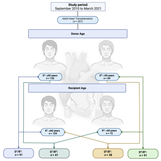 All adult patients (n = 201) who underwent HTx between September 2010 and March 2021 in our department were prospectively enrolled in an institutional database. Patients were retrospectively reviewed and those who underwent cardiac re-transplantation were excluded. Afterwards, patients were divided into four study groups with regard to the recipient and donor age matching (Figure 1). Recipients aged 60 years or younger (n = 129) were declared as young recipients (RY). Correspondingly, recipients undergoing HTx over 60 years of age were declared as old recipients (RO, n = 72). In line with the current literature [10,11], for donors, age limit was set at 50 years (donor age ≤ 50 years: young donors (DY, n = 132), donor age > 50 years: old donors (DO, n = 69)). Accordingly, young recipients with young donors (DY/RY, n = 91) were compared to young recipients with old donors (DO/RY, n = 38) as well as old recipients with young donors (DY/RO, n = 41) and old recipients with old donors (DO/RO, n = 31).