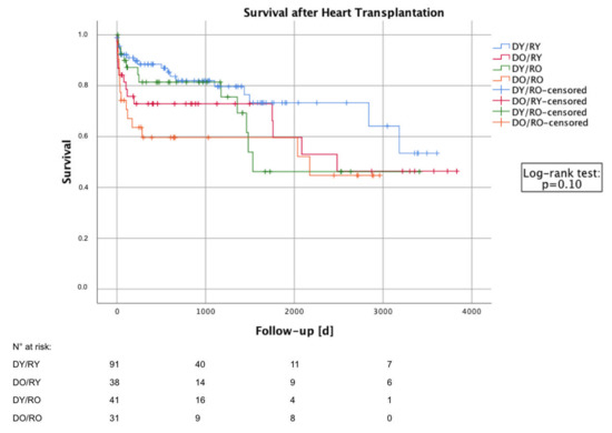 Mean postoperative follow-up was about three years (991 days, SD: 1012 days) with a maximum of ten and a half years (3831 days). As shown in Table 3, 30-day survival was best for recipients of grafts from young donors (DY/RY = 94.4% and DY/RO = 95.0% compared to DO/RY = 84.2% and DO/RO = 80.6%, p = 0.05). The primary end-point of one-year survival was still best for DY/RY (86.1%), followed by comparable results for DY/RO (78.8%) and DO/RY (74.2%) but deeply impaired for DO/RO (56.0%) (p = 0.02). The cause of death within the first 30 days as well between 30 days and 1 year did not differ between the four groups. Within the first 30 days, multiple causes of death appeared; however, after 30 days, infective complications were the leading cause of death. Six patients died because of graft failure: three grafts from young and three grafts from old donors. In addition, the Kaplan–Meier survival curve is shown in Figure 2. Log-rank test (p = 0.10) identified no statistical significance between the four curves, but numerical differences indicated similar mid- to long-term results to those for short-term survival.