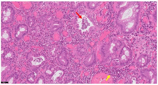 Histology of ulcerative colitis with activity features (H&E stain). Note the typical features: crypt abscesses (neutrophils contained in the crypt lumen—red arrow) and chronic inflammatory infiltrate (yellow arrow).