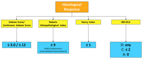 In conclusion, in UC, the groundwork seems to have been done for accepting histological remission as the new therapeutic target. Going beyond endoscopic healing, and even better, integrating it, may lead to finer disease control, potentially changing one’s subsequent disease course, to eventually reach “disease clearance” [51]. Our group recently showed, in a retrospective multicenter analysis including 302 patients, that 51 patients (16.9%) who achieved both endoscopic and histological remission experienced significantly lower rates of hospitalization (7.8% vs. 25.9%, p = 0.008) and surgery (0.0% vs. 8.8%, p = 0.05) compared with patients with endoscopic and/or histological disease activity. Kaplan Meier curves confirmed that patients with disease clearance at baseline had lower risks of surgery (p = 0.04) and hospitalization (hazard ratio (HR) = 0.49, 95% confidence interval (CI) 0.08–2.29, p = 0.009) [52]. As in clinical practice, this target may still seem ambitious, we suggest that histological activity should be taken into account when decision-making is doubtful (for instance, whether to escalate treatment or not). Currently accepted definitions of histological remission and response in UC, using validated scoring systems, are outlined in Figure 3 and Figure 4. Further data need to be collected in CD before drawing firm conclusions.