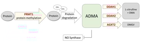 Scheme of enzymatic pathways for biosynthesis and metabolism of asymmetric dimethylarginine (ADMA). L-arginine residues within specific proteins are subject to methylation by protein arginine N-methyltransferases (PRMTs), amongst which PRMT1 has been identified to be the major isoform generating ADMA. Free ADMA is released during physiological protein turnover. ADMA is a competitive inhibitor of nitric oxide (NO) synthase. ADMA is mainly degraded by dimethylarginine dimethylaminohydrolases (DDAH1 and DDAH2) into L-citrulline and dimethylamine (DMA). It may be cleaved by an alternative pathway through alanine glyoxylate aminotransferase 2 (AGXT2), resulting in the formation of asymmetric dimethylguanidinovaleric acid (DMGV). Enzymes of which we have analyzed genetic variance in this study are marked in bold red type within the yellow arrows.
