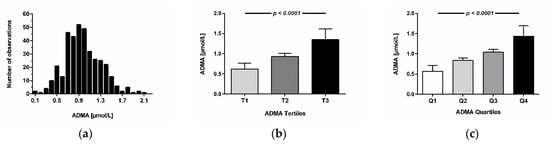 (a) Histogram depicting the distribution of circulating ADMA concentrations in the study cohort. Data are shown as absolute frequencies of ADMA concentrations in 377 adult humans split up in 0.1 µmol/L intervals. (b) ADMA concentration in tertiles of ADMA (first tertile, N = 121; second tertile, N = 128; third tertile, N = 128). (c) ADMA concentration in quartiles of ADMA (first quartile, N = 88; second quartile, N = 99; third quartile, N = 96; fourth quartile, N = 94). Data are depicted as mean ± SD. p-values denote statistical significance for two-sided one-way ANOVA.