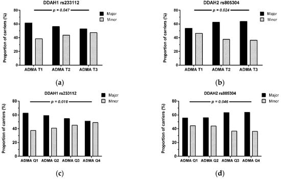 We next subdivided individuals by tertiles and quartiles of ADMA concentration and assessed differences in allele frequencies for all SNPs across ADMA tertiles and quartiles. With increasing tertiles of ADMA, the frequency of the major allele of DDAH1 rs233112 decreased significantly (p = 0.047; Figure 3a); by contrast, the frequency of the major allele of DDAH2 rs805304 increased significantly (p = 0.024; Figure 3b). When we analyzed allele frequencies for quartiles of ADMA, the differences in allele frequencies of DDAH1 rs2331112 and DDAH2 rs805304 retained statistical significance (p = 0.018 and p = 0.046, respectively; Figure 3c,d).