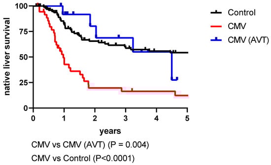 Native-liver survival in cytomegalovirus (CMV) positive patients with biliary atresia, with or without antiviral treatment (AVT) and CMV-negative controls in one of the participating centres (London). Log rank survival.