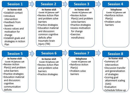 - Winter, L.; Moriarty, H.J.; Robinson, K.; Piersol, C.; Vause-Earland, T.; Newhart, B.; Iacovone, D.B.; Hodgson, N.; Gitlin, L.N. Efficacy and acceptability of a home-based, family-inclusive intervention for veterans with TBI: A randomized controlled trial. Brain Inj. 2016, 30, 373–387. [Google Scholar] [CrossRef]