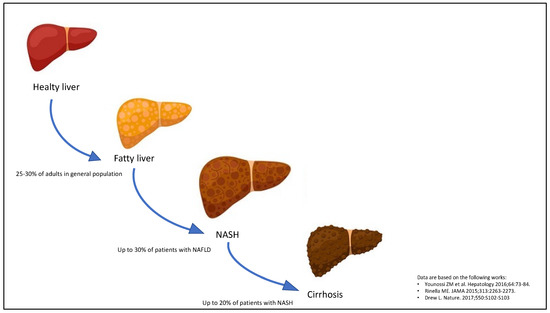 Non-alcoholic fatty liver disease (NAFLD) is a metabolic liver disease, which classically includes a spectrum of progressive pathological conditions, ranging from simple steatosis to non-alcoholic steatohepatitis (NASH) with different grades of fibrosis and cirrhosis (Figure 1) [1,2]. At present, NAFLD is the most common chronic liver disease seen day by day in clinical practice, as it affects roughly 25–30% of adults in the general population across various high-income countries [3], up to 70% of patients with type 2 diabetes (T2DM) [4] and all patients with obesity [5]. On the other side, most NAFLD patients have relevant metabolic comorbidities, including atherogenic dyslipidemia (~70%), obesity (~50%), hypertension (~40%) and T2DM (~30%) [6]. In this regard, alongside the increasing prevalence of metabolic syndrome worldwide, the overall prevalence of NAFLD is believed to rise further in the coming years.