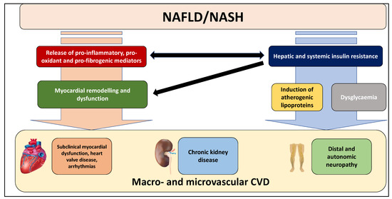 This narrative review will discuss the current evidence regarding the association between NAFLD and the risk of macro- and microvascular CVD (Figure 2). In particular, it will describe the association between NAFLD and the risk of sub-clinical myocardial remodelling and dysfunction, heart valve diseases, cardiac arrhythmias, chronic kidney disease, distal or autonomic neuropathy, retinopathy and fatal and non-fatal cardiovascular events. A brief insight into the biological mechanisms underpinning the association between NAFLD and macro- and microvascular complications has been also given.