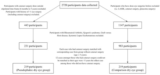 After excluding the above patients, we matched the age of each pseudophakic dry eye case (n = 231) with a corresponding comparison case with no history of cataract surgery (age ± 5 years) and applied the same exclusion criteria to the comparison dry eye group. However, the twelve oldest participants from the cataract group could not be matched because their ages were more than 5 years older than the oldest patient in the comparison group.