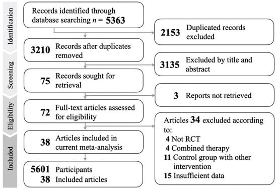 Figure 1 shows the result of our screening process. We identified 5363 articles with our searching strategy. Duplicate articles (n = 2153) were excluded. The abstracts of articles that did not match the selection criteria (n = 3135) were also excluded. Finally, 38 articles out of 72 available full-text articles were included in this meta-analysis. The details of the excluded 34 articles are presented in Supplementary File S1.