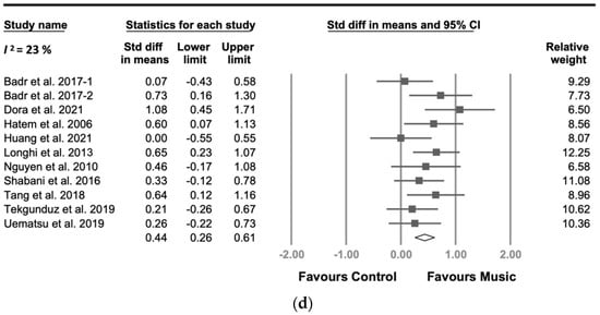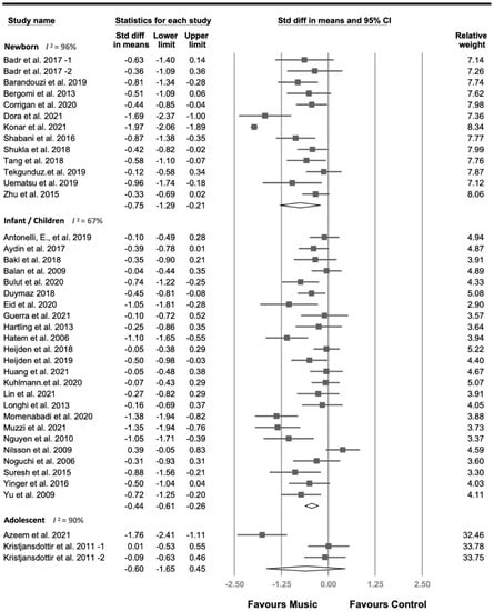 Our study has a number of limitations and offers suggestions for issues that could be addressed in future research. Firstly, finding results with the employed search strategy might be insufficient. For instance, only two articles with three datasets were included for adolescent participants. Future studies may focus on critical factors that may contribute to the analgesic effect of MI specifically in this age group. Secondly, many studies were not double-blinded, which is one of the fundamental challenges of MI. Whether participants or experimenters are aware of the effect of music during the intervention can be considered in future studies to reduce the placebo effect. Thirdly, a high heterogeneity was shown even in the subgroup analysis (Figure 3 and Table 2). Therefore, it is possible that some unnoticed factors may have not been categorized in our current analysis, and these factors may play an essential role in the effect of MI on pain. For instance, adolescents might have developed their preference of music style, and providing music that was unappealing to them may have reduced the effectiveness of the intervention []. Alternatively, the high heterogeneity might reveal the heterogeneity of studies we included in the meta-analysis. However, we considered that 40 comparisons in our meta-analysis would provide a reliable estimation of the analgesic effect of MI. Lastly, the subject number (total n = 3095) of an included study [] was much larger than those of other included studies, which may have influenced the outcomes of our analyses. To this end, software CAM automatically provided a relative weight for correction. Therefore, the results should also be reliable.