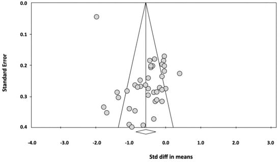 Sensitivity analysis was conducted on selection bias by including only high-quality studies on randomization and allocation concealment [,,,,,,,,,,,,] and revealed a significantly median to large effect size (k = 13, n = 4022, SMD = −0.62, 95% CI = −1.20 to −0.04, p = 0.037, I2 = 97%). The result of sensitivity analysis showed a similar effect size as that of the main analysis (SMD = −0.57, p < 0.001), indicating that the main result was robust.