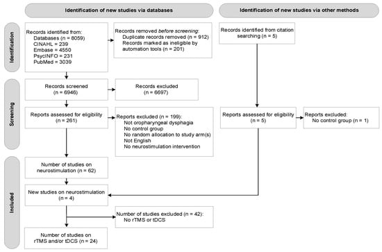 A total of 8059 studies were retrieved through the subject heading and free text searches (CINAHL: n = 239, Embase: n = 4550, PsycINFO: n = 231, and PubMed: n = 3039). Following removal of duplicates at a title and abstract level (n = 1113), a total of 6946 records remained. A total of 261 original articles were assessed at a full-text level, with articles grouped according to type of intervention. At this stage, no studies were excluded based on type of intervention (e.g., behavioural intervention, neurostimulation). Of these, 58 articles on neurostimulation were identified that satisfied the inclusion criteria. Four additional studies were found through reference checking of the included articles. This process resulted in a final number of 24 included studies. Figure 1 presents the flow diagram of the overall reviewing process according to PRISMA.