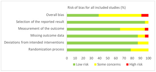 Methodological Quality and Risk of Bias. The Revised Cochrane risk-of-bias tool for randomised trials (RoB 2) [21] was used to assess the methodological quality of the included studies. The RoB 2 tool identifies domains to consider when assessing where bias may have been introduced into a randomised trial: (1) bias arising from the randomisation process; (2) bias due to deviations from intended interventions; (3) bias due to missing outcome data; (4) bias in measurement of the outcome; and (5) bias in selection of the reported result. For each domain, a series of signalling questions are answered to give a judgement (i.e., “low risk of bias”, “some concerns”, or “high risk of bias”), which can then be assessed in aggregate to determine a study’s overall risk of bias [21].