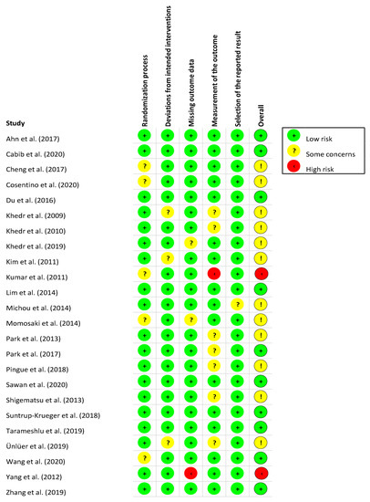 - Sterne, J.; Savović, J.; Page, M.; Elbers, R.; Blencowe, N.; Boutron, I.; Cates, C.; Cheng, H.-Y.; Corbett, M.; Eldridge, S.; et al. RoB 2: A revised tool for assessing risk of bias in randomised trials. BMJ 2019, 366. [Google Scholar] [CrossRef] [Green Version]