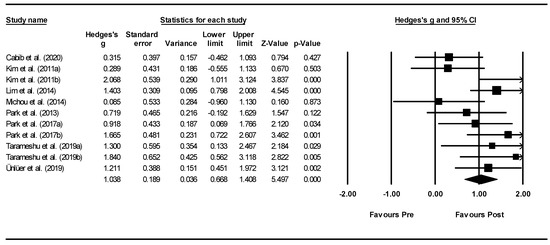 Using Comprehensive Meta-Analysis, a random-effects model was used to calculate effect sizes. This was due to variations in participant characteristics, sampling, interventions, and measurement, which suggested a low likelihood that studies would have similar true effects. Heterogeneity was estimated using the Q statistic to determine the spread of effect sizes about the mean and I2 was used to estimate the ratio of true variance to total variance. I2-values of less than 50%, 50% to 74%, and higher than 75% denote low, moderate, and high heterogeneity, respectively [23]. Effects sizes were generated using the Hedges’ g formula for standardised mean difference with a confidence interval of 95%. Effects sizes were interpreted using Cohen’s d convention as follows: d ≤ 0.2 as no or negligible effect; 0.2 < d ≤ 5 as small effect; 0.5 < d ≤ 0.8 as moderate effect; and d > 0.8 as large effect [24].