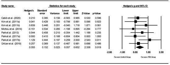 rTMS Intervention (n = 11:Table 2 and Table 3). All but one of the rTMs studies [33] compared rTMS stimulation with sham rTMS. One single study compared rTMS with rTMS combined with DT, and DT only [33]. Three more studies included three arms; two studies compared rTMS using different frequencies versus sham rTMS [32,34], and one study compared bilateral and unilateral rTMS versus sham rTMS [35].