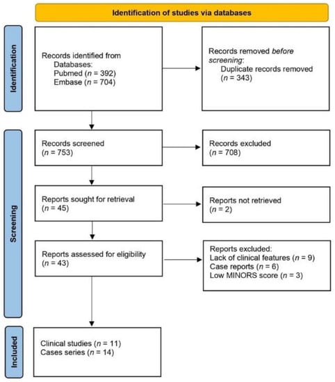 Database searching identified 1096 articles. After removing duplicates, 753 records were screened and 43 were then considered for eligibility. Nine reports were excluded for lack of features; six were excluded because, although not explicitly stated in the title and abstracts, they were case reports. One clinical series [20] and two case series [12,21], although eligible, were excluded for low MINORS scores. Eventually, we selected 10 retrospective studies [22,23,24,25,26,27,28,29,30,31] on recorded cases in a defined period, one prospective study [32], and 14 cases series [9,33,34,35,36,37,38,39,40,41,42,43,44,45]. The flow diagram of the literature search results is shown in Figure 1.