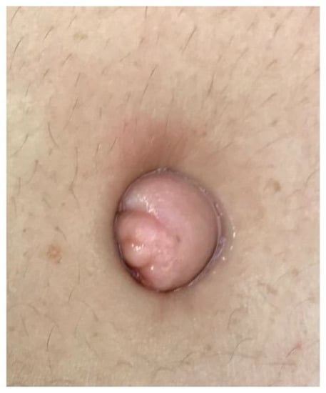 - Mizutani, T.; Sakamoto, Y.; Ochiai, H.; Maeshima, A. Umbilical endometriosis with urachal remnant. Arch. Dermatol. 2012, 148, 1331.e2. [Google Scholar] [CrossRef]