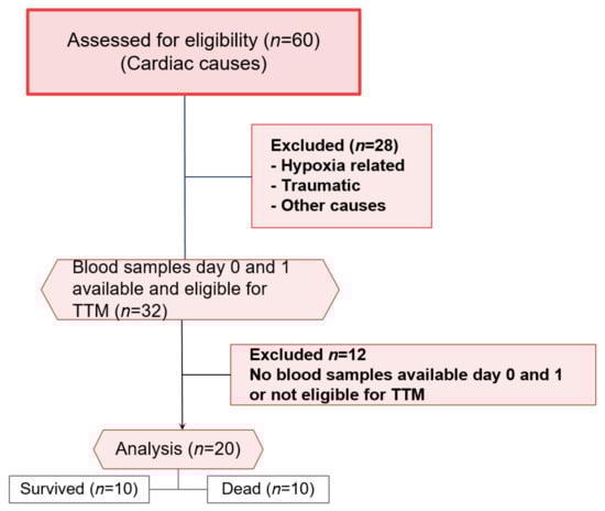 In all patients, blood was drawn on day 0 (i.e., the day of CPR in the emergency department or ICU after arrival) and day 1 (i.e., after 24 h and during TTM). If no blood sample was available for one of both days, patients were excluded from the analysis (Figure 1). Patients that are not eligible for TTM were also excluded from the study. Survivors and non-survivors were dichotomized on the 30th day after CPR to allocate patients to the two compared groups: Survivors vs. non-survivors.