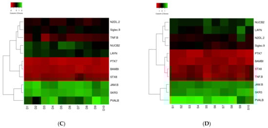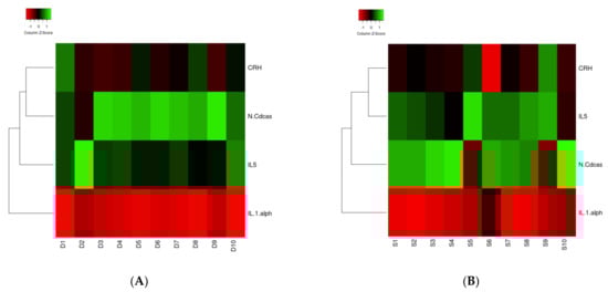Heat map analysis for the four clinically relevant proteins in survivors and non-survivors showed no difference in clustering (Figure 2A,B). IL1A was downregulated, and CRH, IL5, and n-CDAS were upregulated in both groups. Concerning the analysis of the 11 statically significant proteins, clustering for regulation was different for the proteins in surviving and non-surviving patients (Figure 2C,D). Solely clustering of TNF-B was different between both groups and was allocated to another cluster.