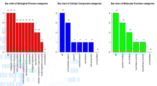- WebGestalt is a tool to interpret the lists of genes from large scale x-OMICS (proteomics, genomics) studies []. The proteins of interest were uploaded to the tool where user IDs are unambiguously mapped to unique Entrez gene IDs, and all of them are mapped from a selected platform genome. Through the GoSlim classification plot, it is possible to examine the distribution of the genes of interest across the major branches of the gene ontology (GO) biological process, cellular component, and molecular function ontologies []. Each biological process, cellular component, and molecular function category is represented by a red, blue, and green bar, respectively.