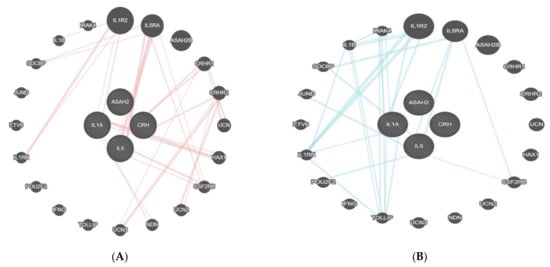 Interleukin-1-alpha (IL1A), n-acylsphingosine amidohydrolase-2 (ASAH2), corticotropin-releasing hormone (CRH), and interleukin-5 (IL5) showed physical interactions with interleukin-1 receptor type 2 (IL1R2), interleukin-5 receptor subunit alpha (IL5RA), corticotropin-releasing hormone receptor-1 (CRHR1), corticotropin-releasing hormone receptor-2 (CRHR2), and other proteins (Figure 4A). Additionally, the pathway interaction of these proteins was studied. IL1A and IL5, in their pathways, present several important proteins, such as IL1R2, IL5RA, interleukin-1 receptor-associated kinase 4 (IRAK4), and cytokine receptor common subunit beta (CSF2RB) (Figure 4B).