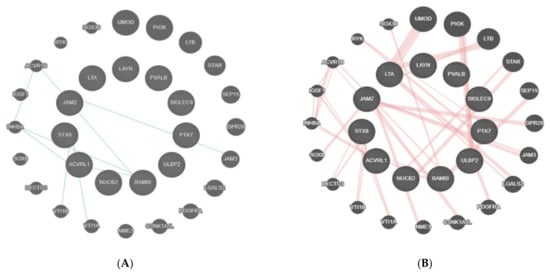 After the bioinformatic analysis, the 11 proteins that were found as statistically significant (t-test) had pathway interactions only with a few proteins, such as activin receptor type-1B (ACVR1B), junctional adhesion molecule 3 (JAM3), vesicle transport through interaction with T-SNAREs 1A and IB (VTI1A VTI1B), and inhibin subunit beta A (INHBA) (Figure 5A). The physical interactions of these genes included links with proteins, such as uromodulin (UMOD), phosphatidylinositol glycan anchor biosynthesis class K LTB (PIGK), SRY-box transcription factor 30 (SOX30), etc. (Figure 5B).